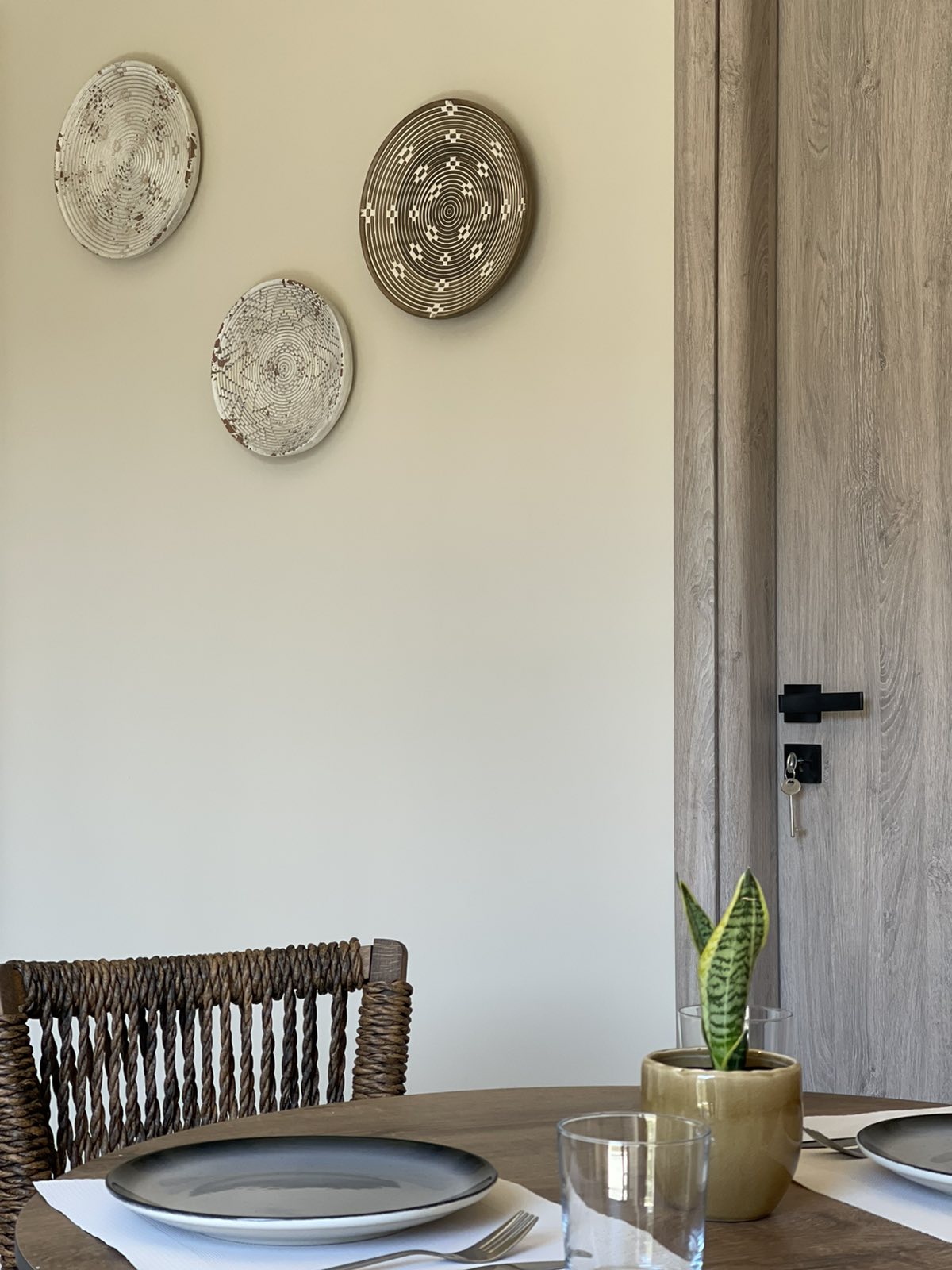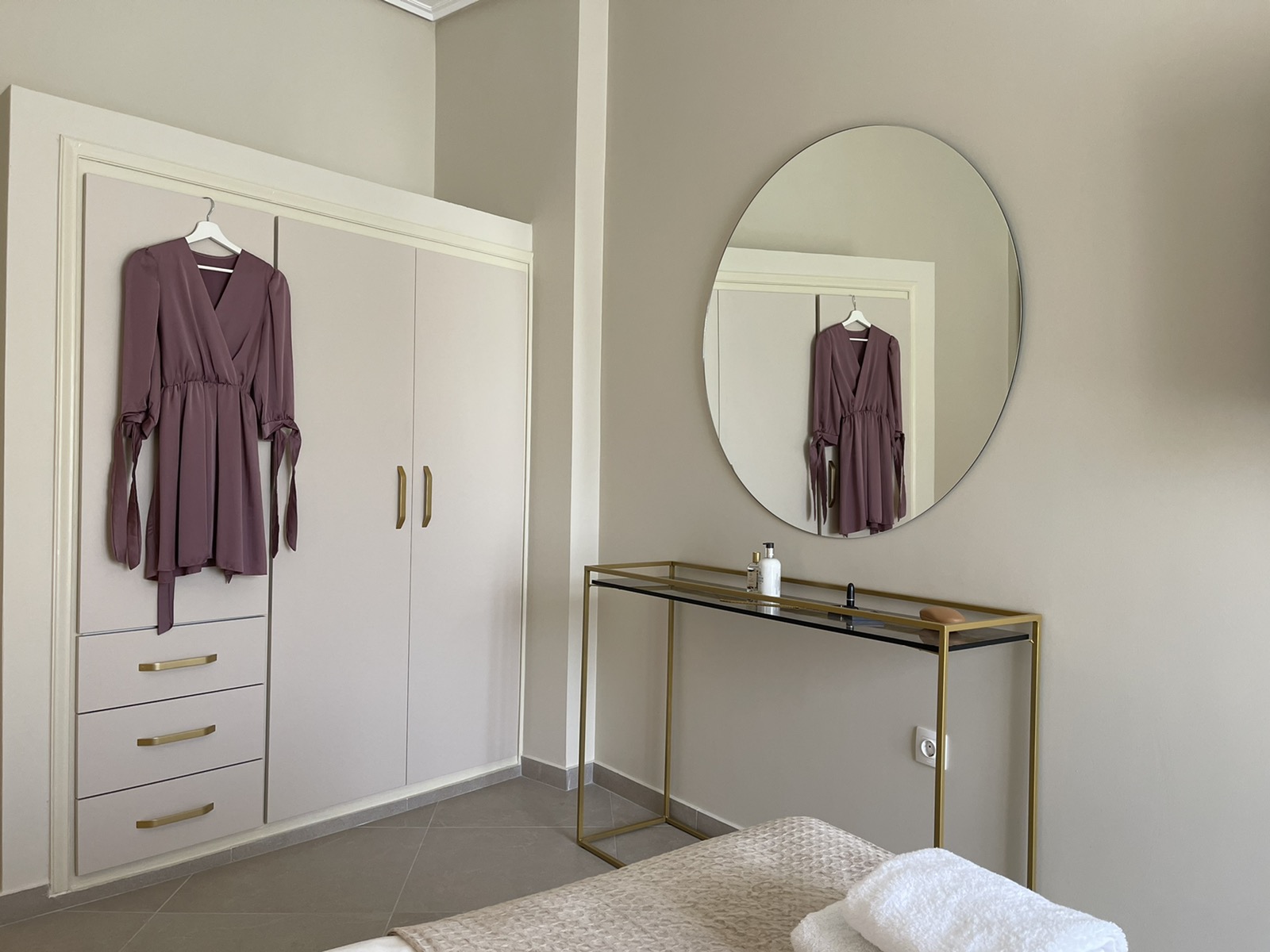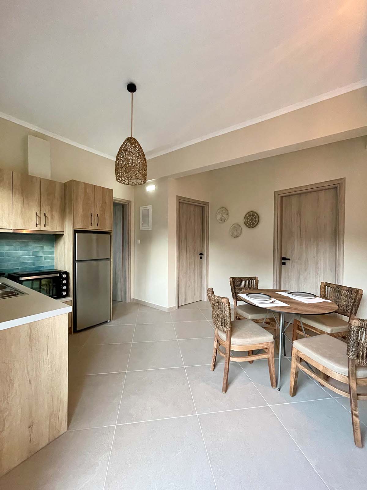 Μια κομψή ροτόντα τραπεζαρία καθώς και μια πλήρως εξοπλισμένη κουζίνα, σε γήινους τόνους θα συμπληρώσει το στυλιστικό αποτέλεσμα.